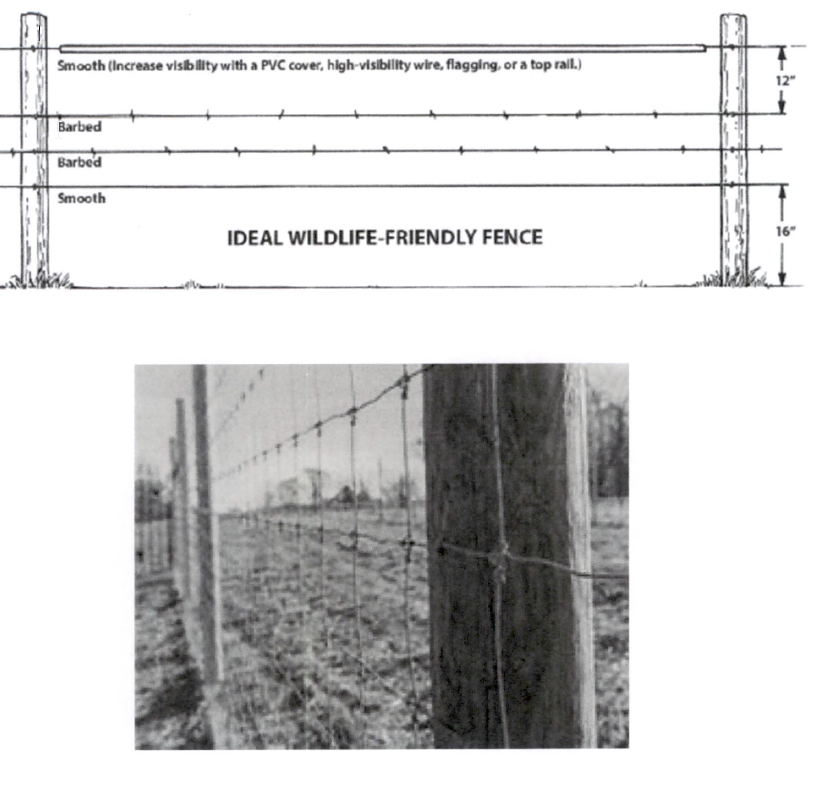 Permeable fencing. Fencing that allows wildlife to pass through. Examples include typical barbwire fencing, wire fencing with larger holes than traditional chain link fence or woven wire, or wildlife corridors for larger wildlife.