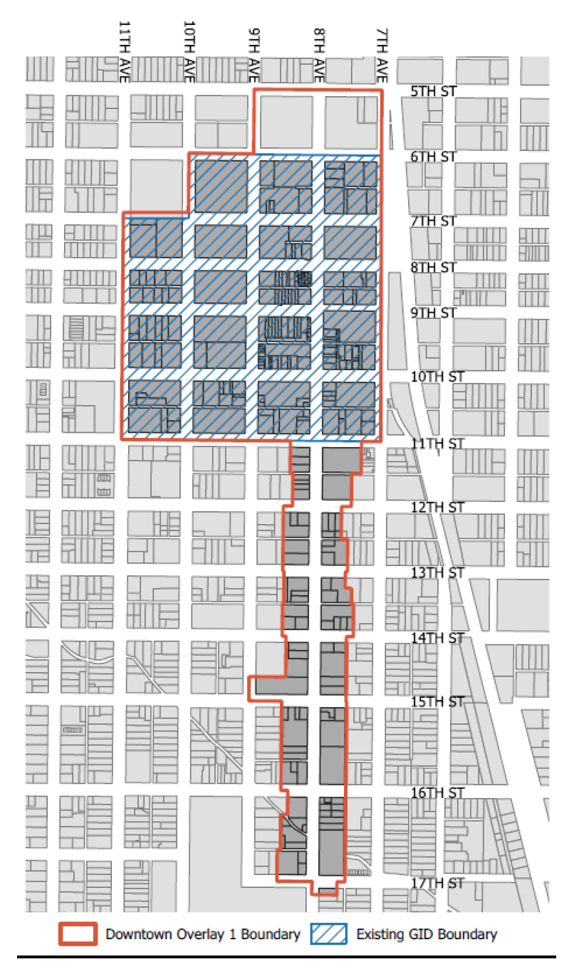Downtown entertainment district. The downtown entertainment district shall include area within the south curb flow line of 7th Street, the west curb flow line of 8th Avenue, the north curb flow line of 10th Street and the east curb flow line of 9th Avenue. In addition to compliance with all aspects of this section, any promotional association created to manage common consumption areas within the downtown entertainment district shall include an official representative of the downtown development authority as a director of any promotional associations which may be authorized therein by the local licensing authority.