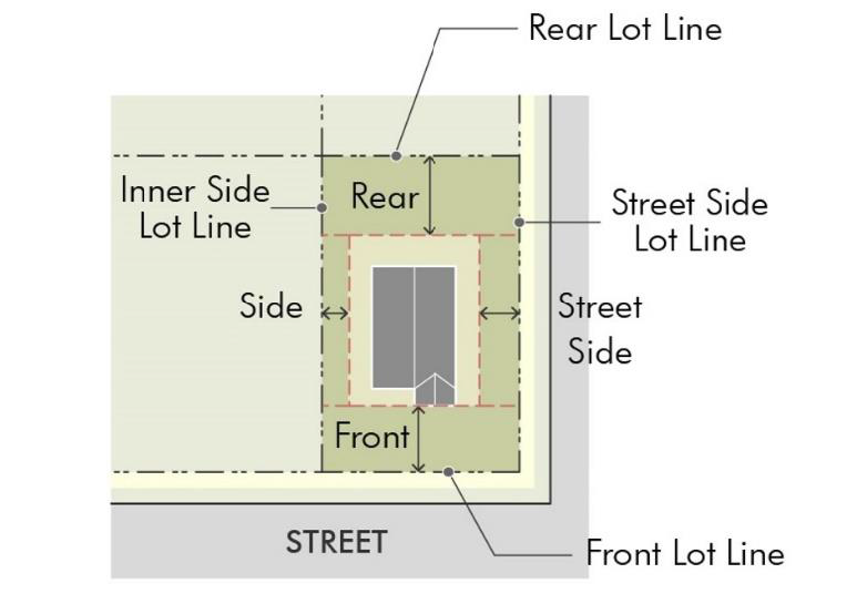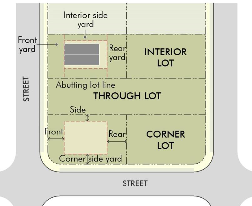 Yard, interior side. An open-space area between the interior side property line and the building setback line, extending between the front building setback line and the rear building setback line.