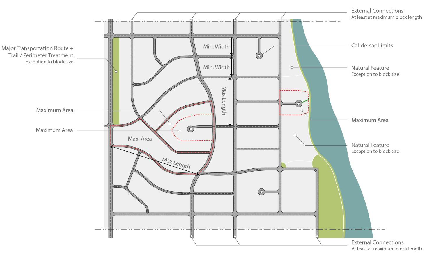 Average block sizes for the project as a whole implement a comparable or greater degree of connectivity, particularly considering the frequency of collector and neighborhood connector streets that can extend beyond the project.