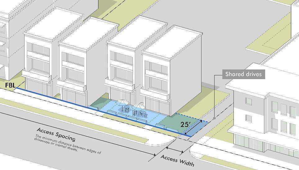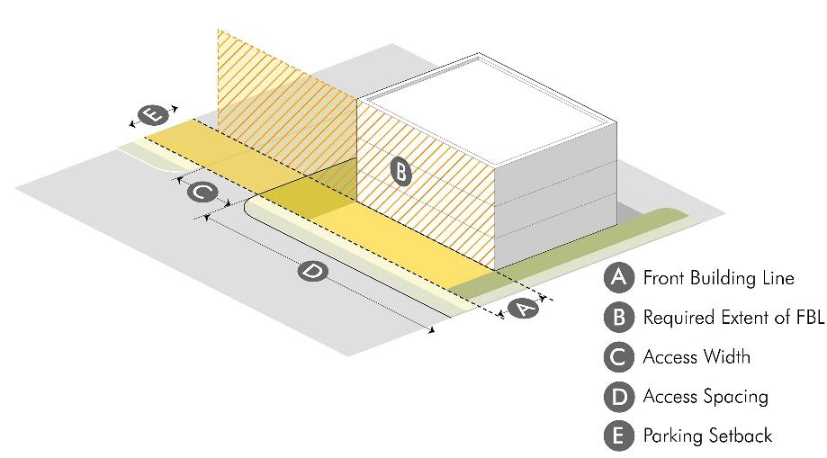 Streets with higher traffic speeds or volumes, that lack pedestrian amenities, or that lack on-street parking are generally appropriate for Frontage C and Frontage D frontage type and design standards.