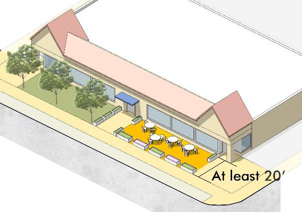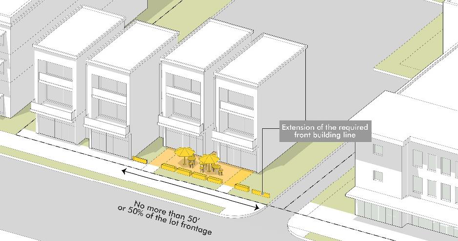 Courtyards, plazas, patios, or similar outdoor seating areas that are either designed as an extension of the public streetscape on the frontage, or at least 500 square feet and 20 feet in all directions if internal to the site;