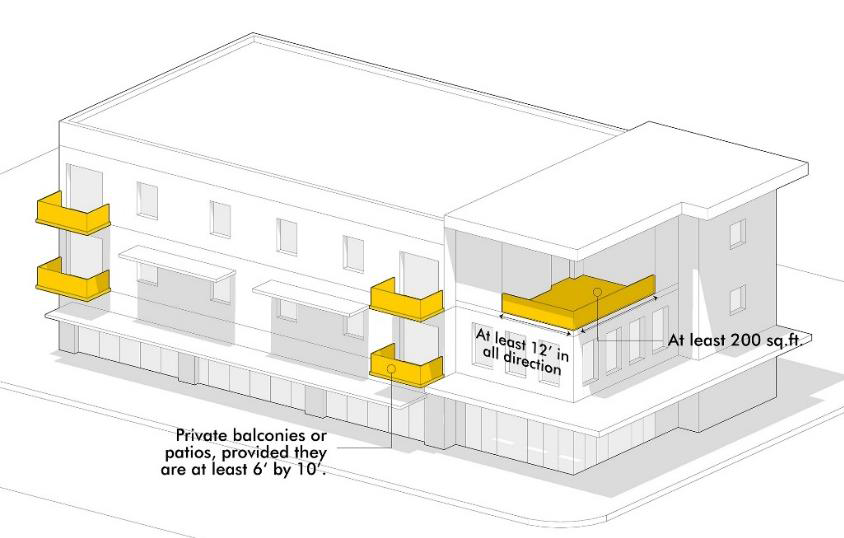 Private balconies or patios, provided they are at least six feet by ten feet — this space is limited to no more than 25 percent of the requirement for the lot and building; or