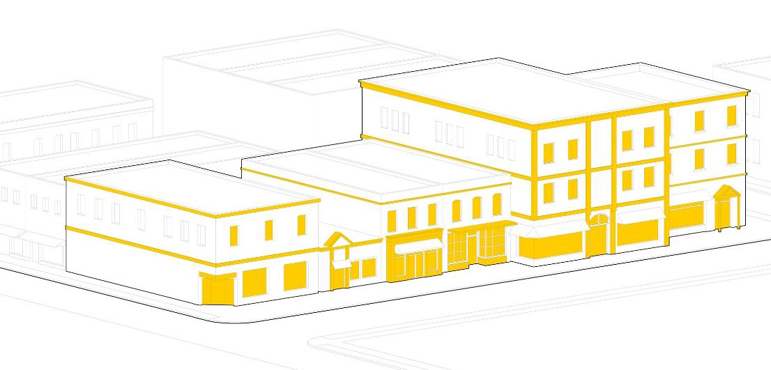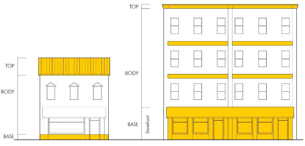 Figure 24-6-11: Façade Composition. The combination of massing, modulation, entrances, and window transparency determine