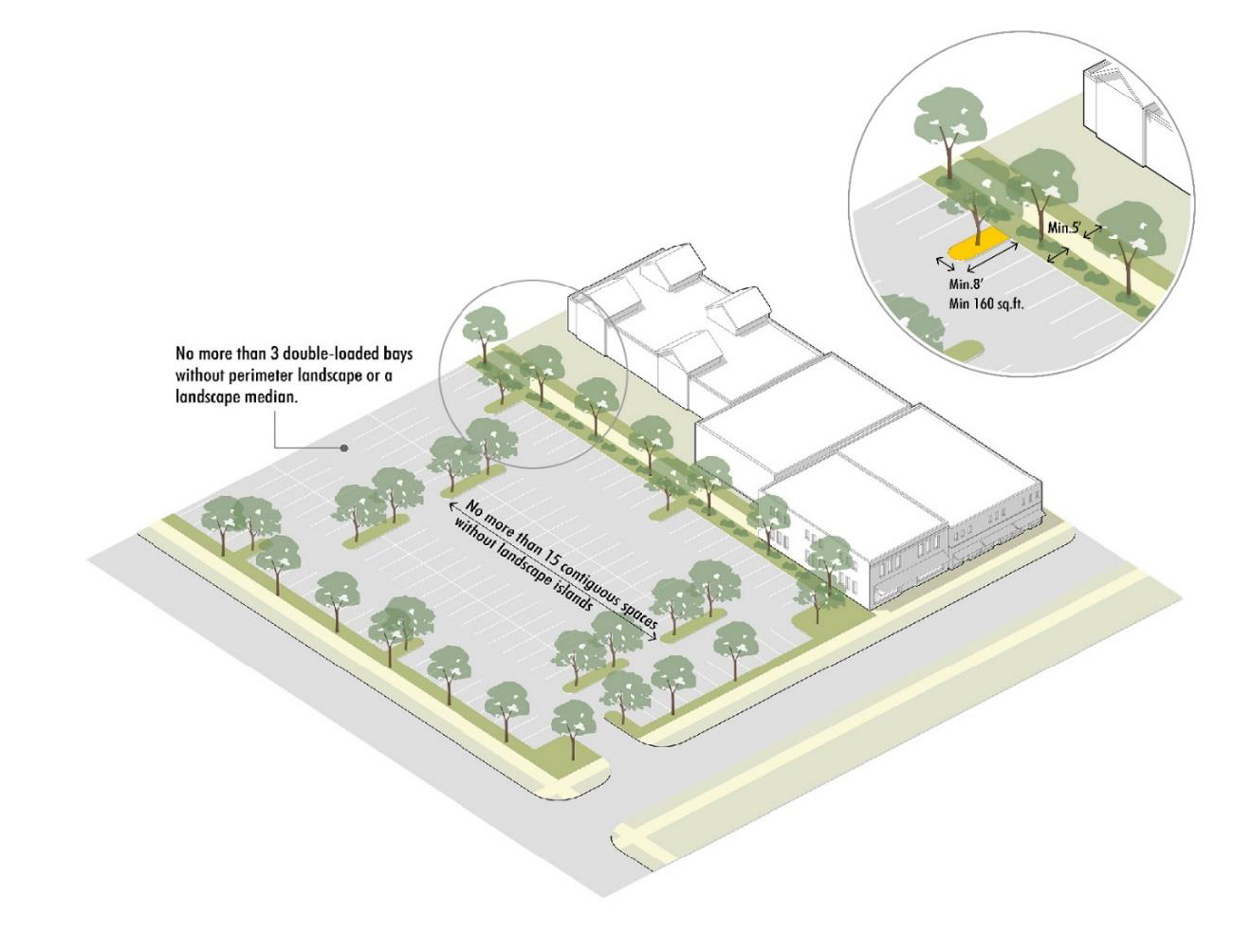 Parking rows shall be no more than 15 contiguous spaces without landscape islands (end caps, center islands, or peninsulas), or no more than three double-loaded bays without perimeter landscape or a landscape median. This may be adjusted on a specific site plan that results in the same amount of islands and landscape on average for the entire parking lot.