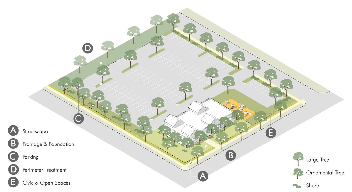 Frame important streets and emphasize gateways with street trees, landscape massing, and other vertical elements.
