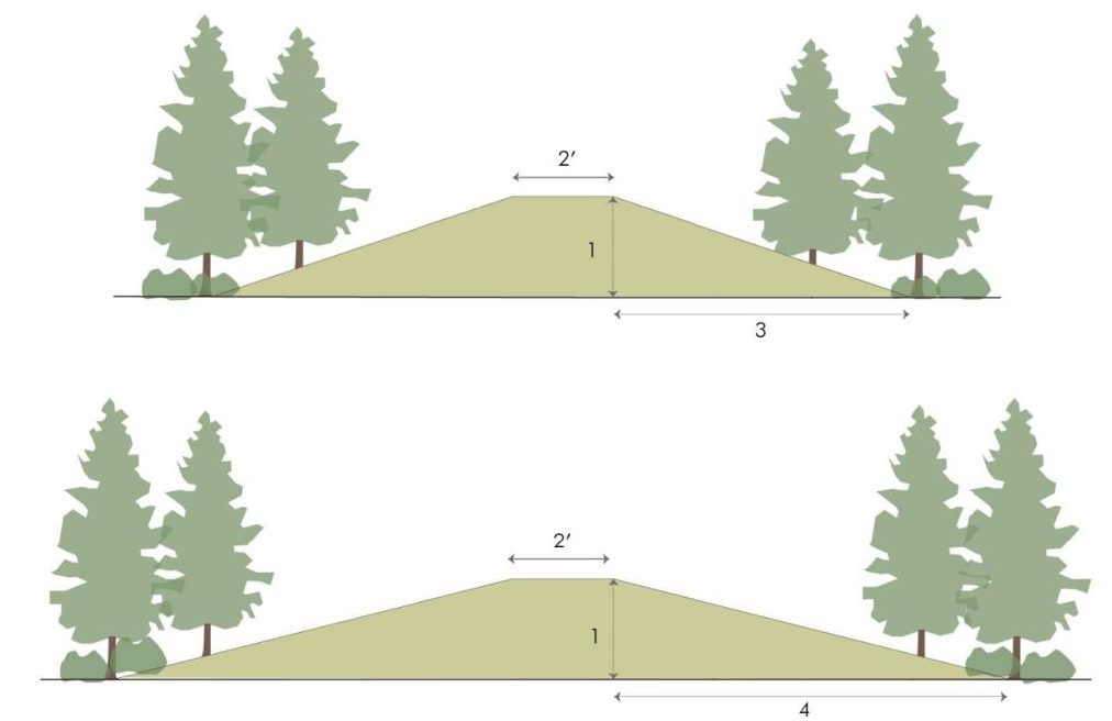 Berms shall have a slope not exceeding a horizontal to vertical ratio of no less than 3:1 ratio to no greater than a 4:1 ratio for turf-grass mowing, and must have a crown width of at least two feet.
