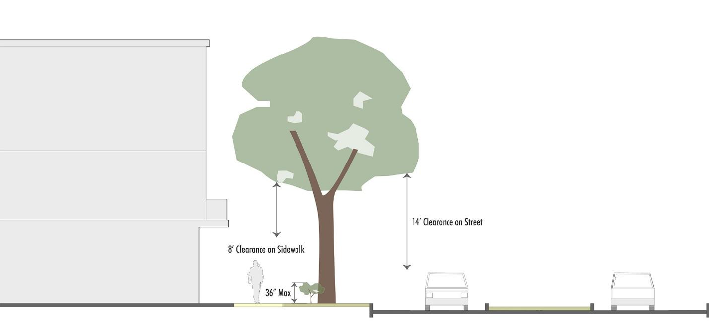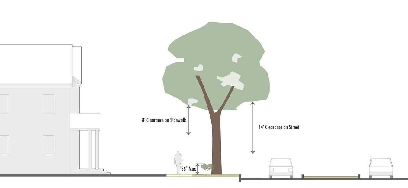 Trees shall maintain a clearance of at least eight feet above any sidewalk and at least 14 feet above any street or similar vehicle access way.