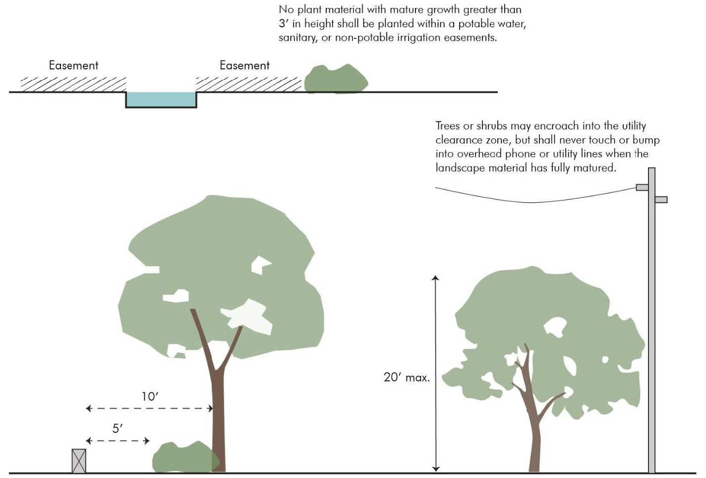Trees or shrubs may encroach into the utility clearance zone but shall never touch or bump into overhead phone or utility lines when the landscape material has fully matured. Shorter ornamental trees with a maximum height of 20 feet are typically acceptable but shall follow service provider guidelines.