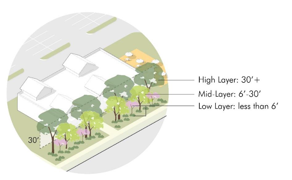 Address layers of screens, including shade trees (high layer — 30'+); evergreen or ornamental trees (mid-layer — 6' to 30'); and shrubs, annuals and perennials, and ground cover (low layer — under 6'), in a way that most directly mitigates the potential impacts and adjacencies.