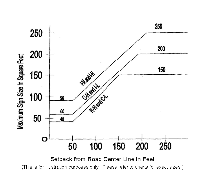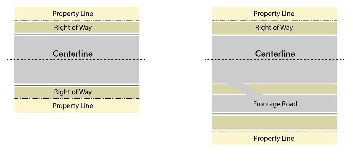 Sign setbacks. Sign setbacks are the minimum distance required between the apparent centerline of the right-of-way and any portion of a sign or sign structure. Where the property is adjacent to a frontage road, the centerline of the highway to the leading edge of the sign is used to determine setback (i.e., frontage road is disregarded for calculation of the setback).