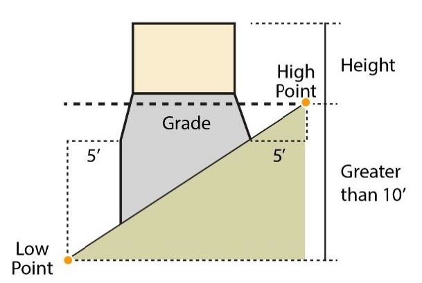 The elevation of the highest ground surface within a five-foot horizontal distance from the leading edge of the sign, when there is less than a ten-foot difference between the highest and lowest ground surfaces within a five-foot horizontal distance from said sign; or