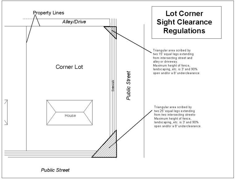 Within the vision triangle, defined as the triangular area defined by two 15-foot legs extending from intersecting street and alley or driveway, and the triangular area, defined as the triangular area defined by two 25-foot legs extending from two intersecting streets, the following clearances shall be observed: