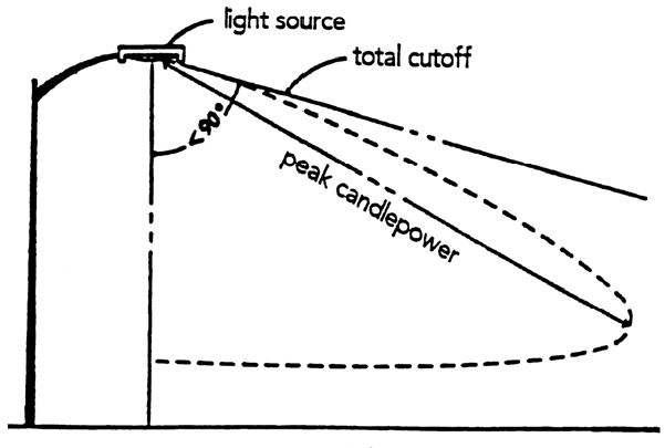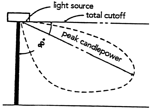 When the light source has full cutoff of an angle less than 90 degrees and the light source is completely shielded from the direct view of an observer at five feet above the ground, at the point where the cutoff angle intersects the ground: