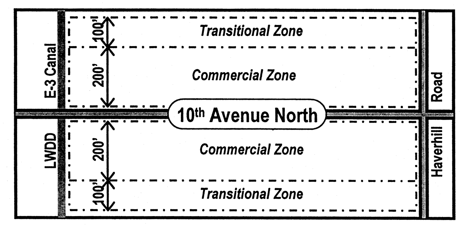The Lake Worth Road Urban Corridor (UC) overlay district shall be applicable for a distance of up to approximately seven hundred fifty (750) feet north and south of Lake Worth Road, between Via Poinciana Drive and Military Trail for those properties with a Commercial (CM) future land use designation. More specifically, this district is further subdivided into location specific sub-districts that account for the difference in the layout and physical characteristics of the area since the corridor was developed at different times and under varying jurisdictions. The corridor has two (2) major arterial intersections, as well as mid-block commercial development, and an area originally platted as single-family lots.
