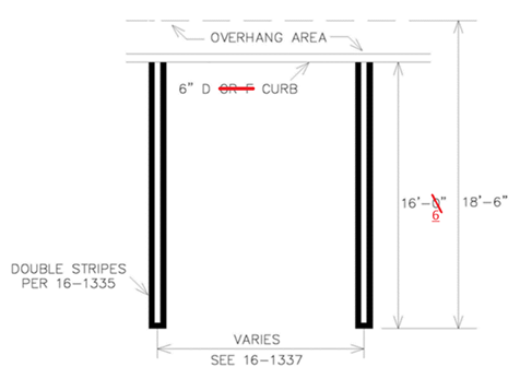 In order to protect landscape areas from encroachment and to enhance the amount of pervious area in parking lots, each parking stall may be 16'-6" deep with an additional 2' overhang when abutting a landscape area. In such cases, the parking stall shall include a continuous raised FDOT Type "D" curb at the far end, with the near face of the curb set 16'-6" into the stall. In lieu of asphalt, the resulting overhang area (2' for a typical 18'-6" deep 90-degree parking stall per Table 16-1337(a)) shall be sod and groundcover when abutting a landscape area. The overhang area does not count toward the minimum required perimeter landscape buffer. (See Figure 16-1335(18))