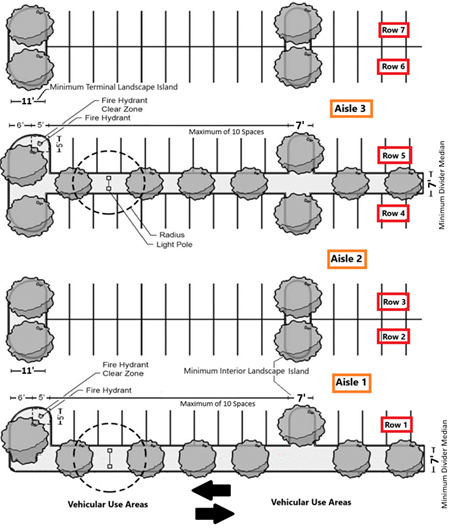 Divider landscape medians. Divider landscape medians with a minimum net plantable width of seven (7) feet shall be installed after every fourth row of parking spaces or the second parking aisle, and between all parking spaces and adjacent vehicular use areas as shown in Figure 16-1335(5).