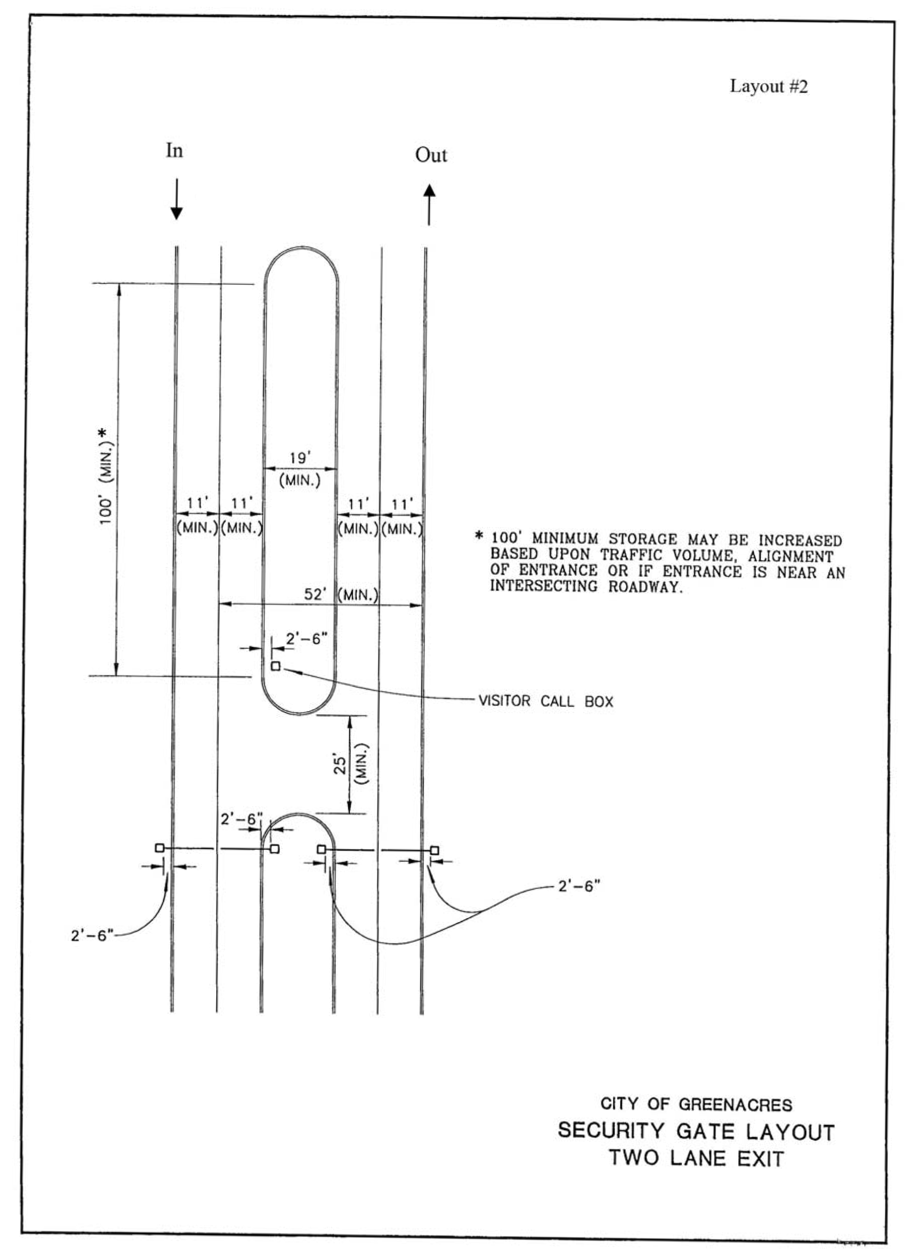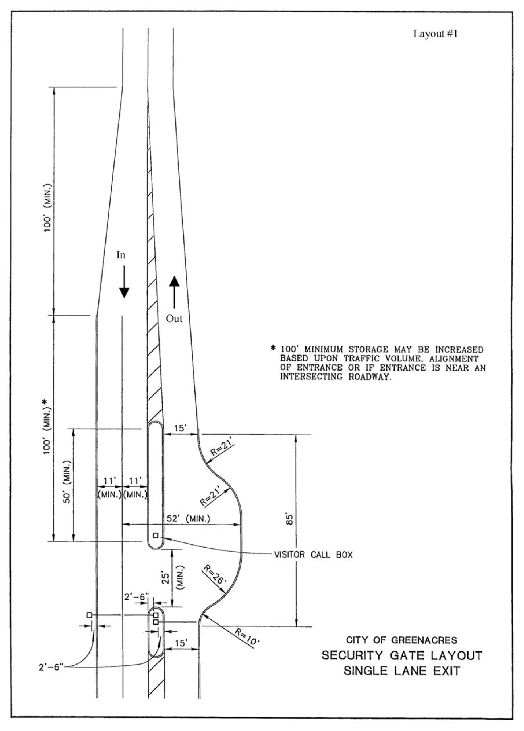 An entry gate configuration different from that depicted in Layouts 1 or 2, Figure 16-1339(3)(a) and Figure 16-1339(3)(b), respectively, may be allowed if it provides equivalent maneuvering and safety and has been approved by the city's traffic engineering consultant. This includes the use of gates that open automatically using a pavement loop or other sensor and do not require any action by the driver to achieve entry.