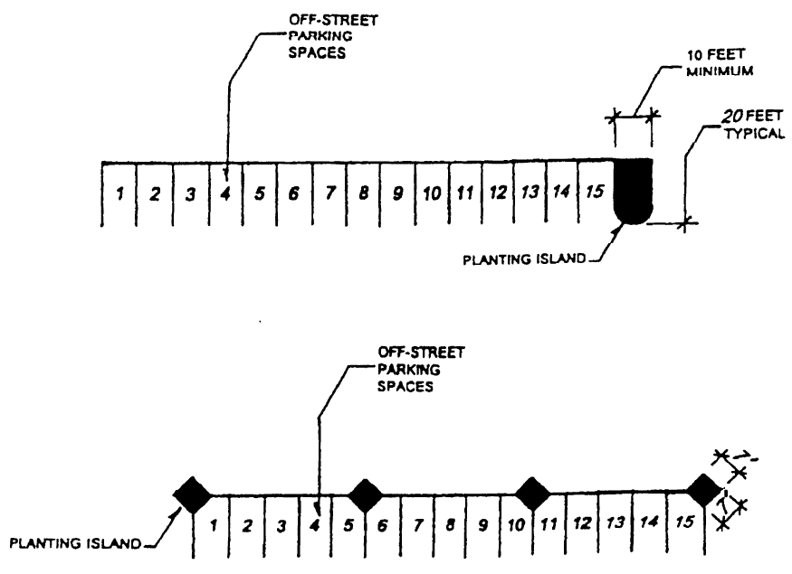 Figure 21.06.0310(A) graphically indicates two (2) alternative approaches to the provision of two hundred (200) square feet of the required planting island area; however, where planting island areas are designed as vegetated stormwater control measures, the location, dimension and size of these areas should reflect the approved Stormwater Management Plan.