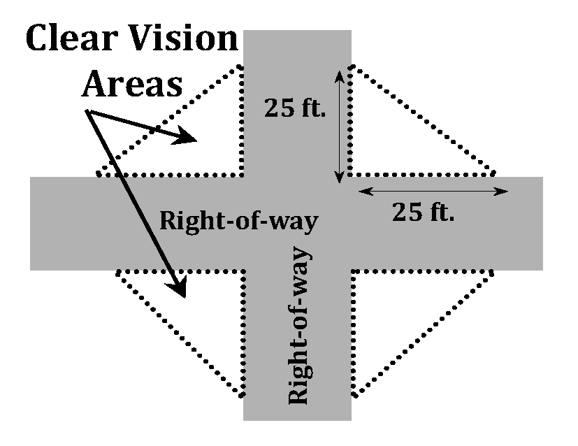 No plantings shall be established or maintained on any lot, which will obstruct the view of a vehicle driver approaching a street intersection. There shall be maintained an unobstructed triangular area formed by the street property lines and a line connecting them at points 15 feet from the intersection of the street lines, or, in the case of a rounded property corner, from the intersection of the street property lines extended. This provision shall not prohibit the planting of landscaping which will be less than 30 inches in height at maturity and maintained at that height or lower.