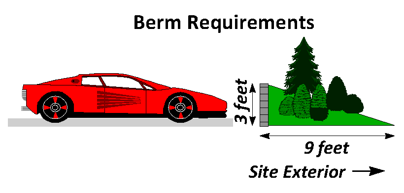 If berming is used for all or part of the obscuring screen, all required plant materials shall be placed on the top and both sides of the slope. Where necessary the minimum buffer width shall be increased to accommodate side slopes of a maximum of three feet in width to one foot in height.