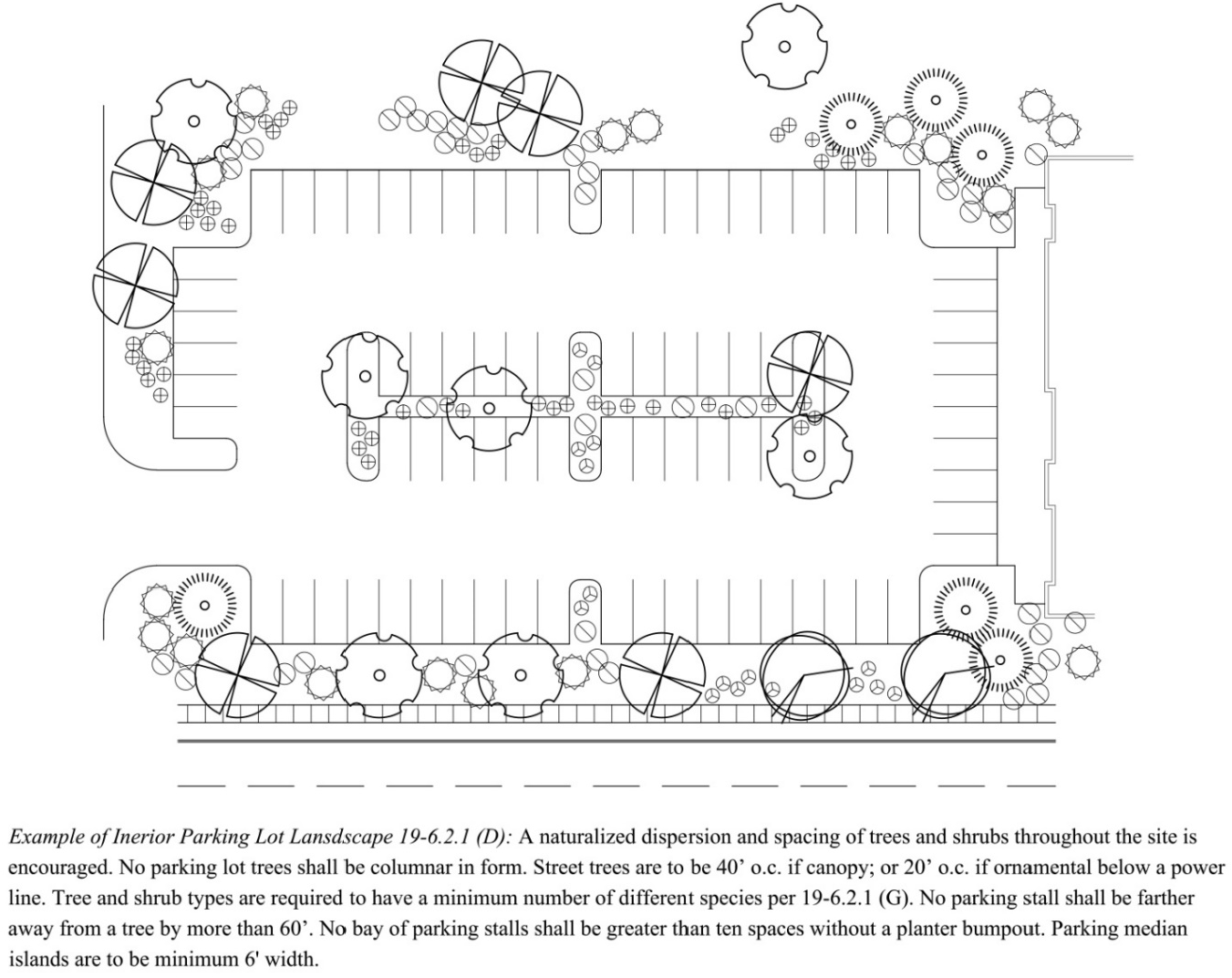 Low impact development (LID) techniques required. All parking areas which exceed the number of parking spaces required by the minimum spaces required column and equal to or less than the maximum spaces allowed column as listed in Table 19.6-6-1-1 shall incorporate low impact development (LID) techniques for the area in which there are excess spaces. Each LID technique shall be approved by the administrator. Examples include but are not limited to bioretention areas and vegetative filter strips. The LID technique shall be sized to treat the first 0.5 inches of runoff from the excess spaces and will be in addition to the stormwater requirements set forth in article 19-7, stormwater management.