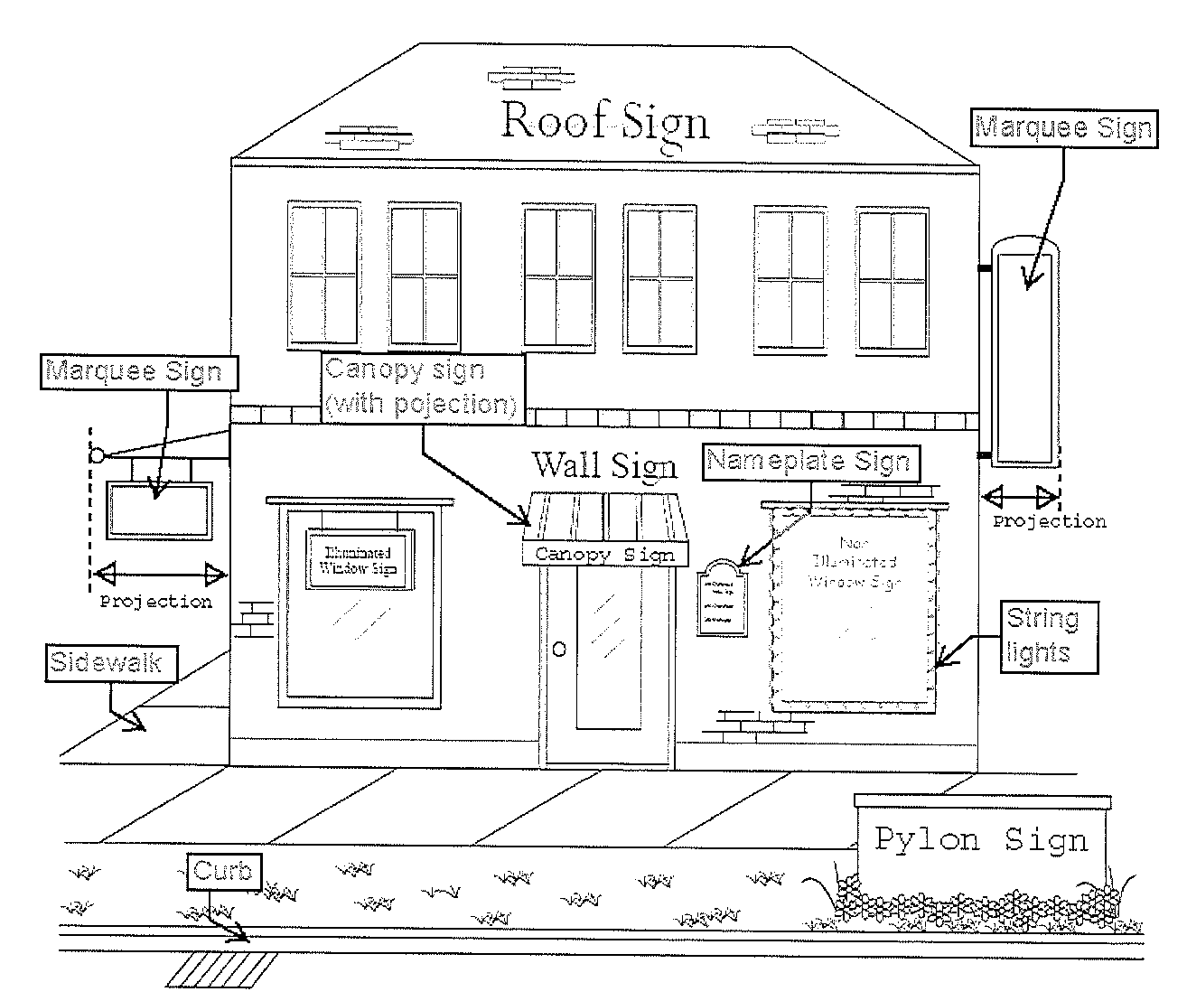 Height. In a B-1 district, no freestanding sign shall project higher than 15 feet above the curb, and no sign shall project above the principal building to which it is affixed. In the B-2 and B-3 districts no sign shall project higher than 35 feet above the curb level or where no curb exists, above the average level of the ground on which the sign exists, and in no case shall a sign project more than 12 feet above the roof line or above the parapet line should one exist.