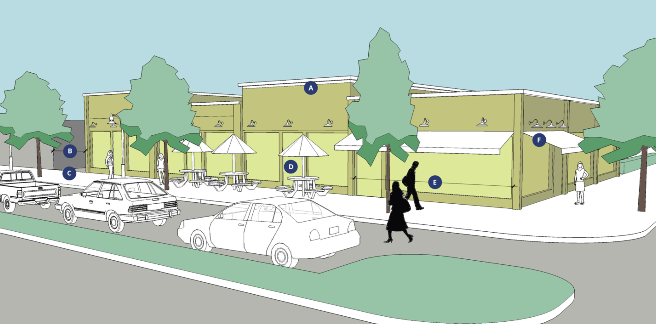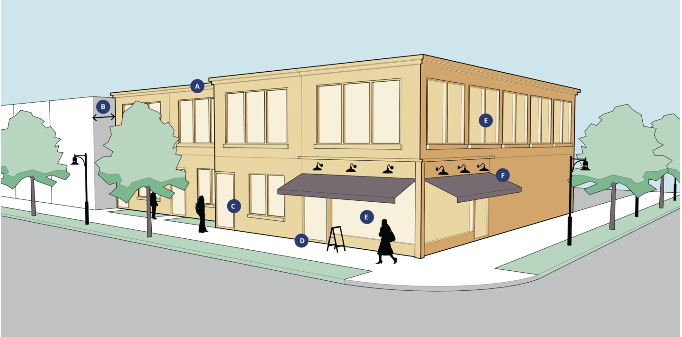 Exterior finish materials and colors must be in natural tones and consistent, or compatible, with the character of the surrounding district to create a uniform and recognizable identity. Accent colors are permitted to activate the street front and exercise artistic placemaking; this standard is to not be interpreted as prohibiting the incorporation of public art, such as a mural, to buildings or sites. All architectural features, including awnings, overhangs, roof projections, window accents, and the like must be compatible with the style, materials, and colors of the building.
