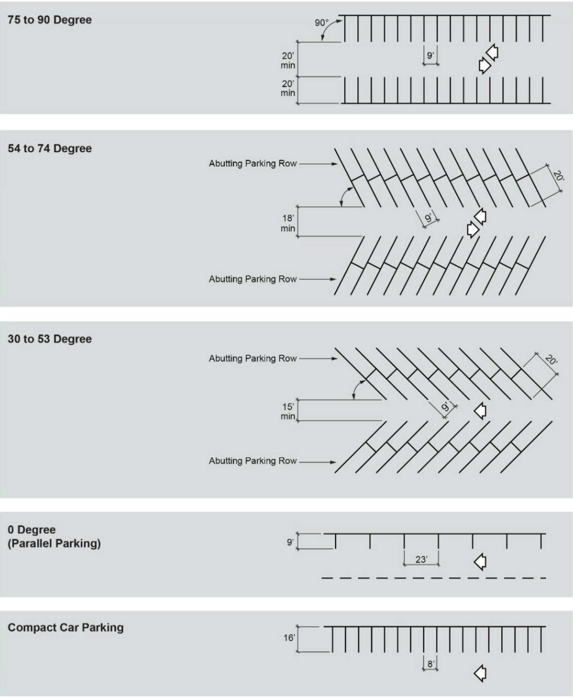Dimensions. Parking facilities must be in accord with the following dimensions. See table below for more detail.