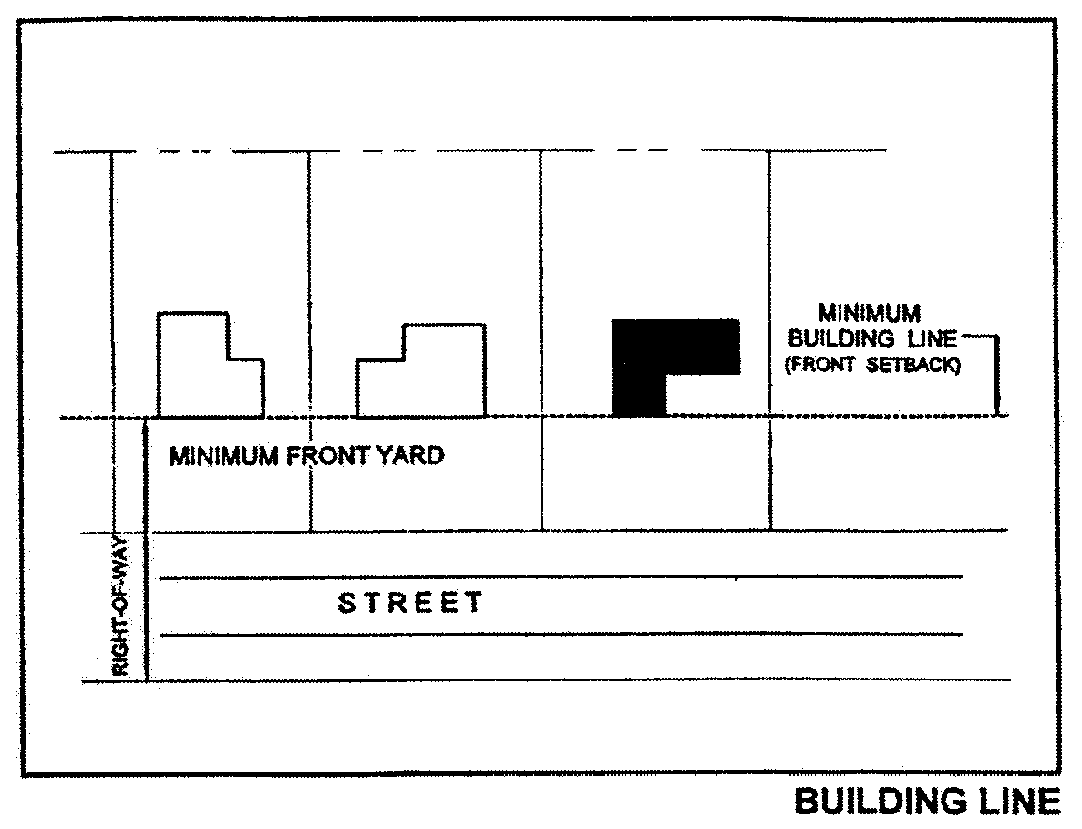 Setback means the minimum horizontal distance between any side of the main building and any adjoining property boundaries, such as the front of the building, excluding only the steps, and the front lot line or street right-of-way line.