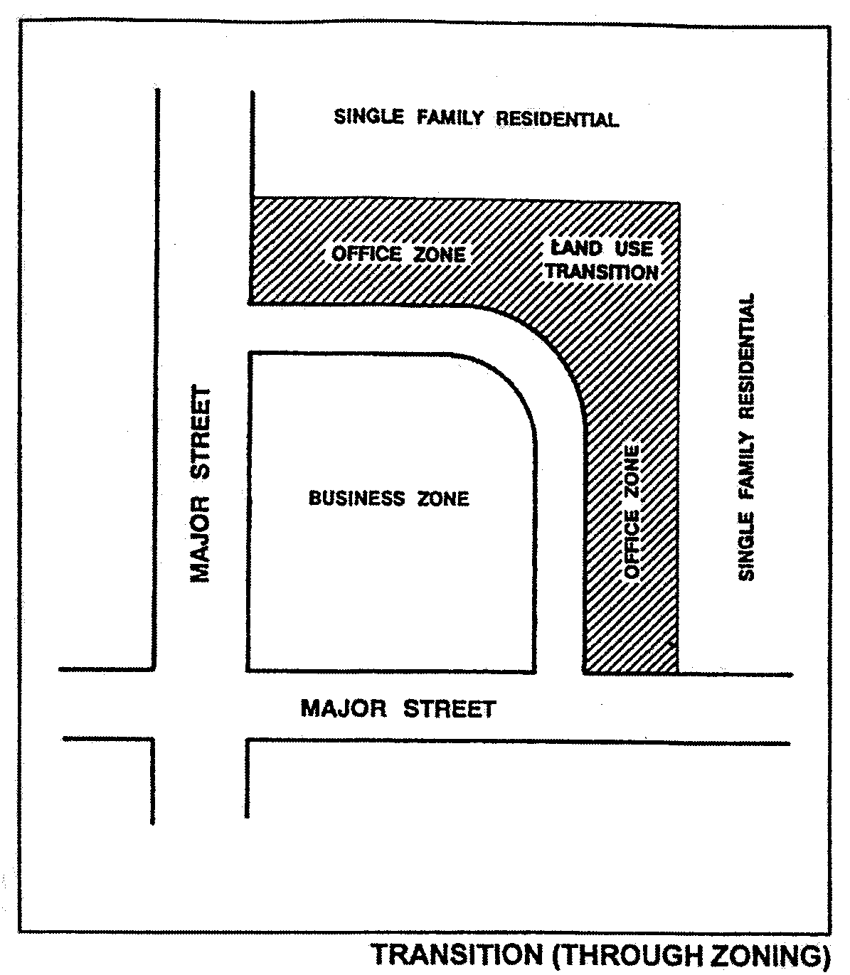 Transition and transitional mean a zoning district, a landscaped area, arrangement of lots, wall or other means which may serve as a district or area of transition; i.e., a buffer zone between various land use districts and/or land use and thoroughfares.