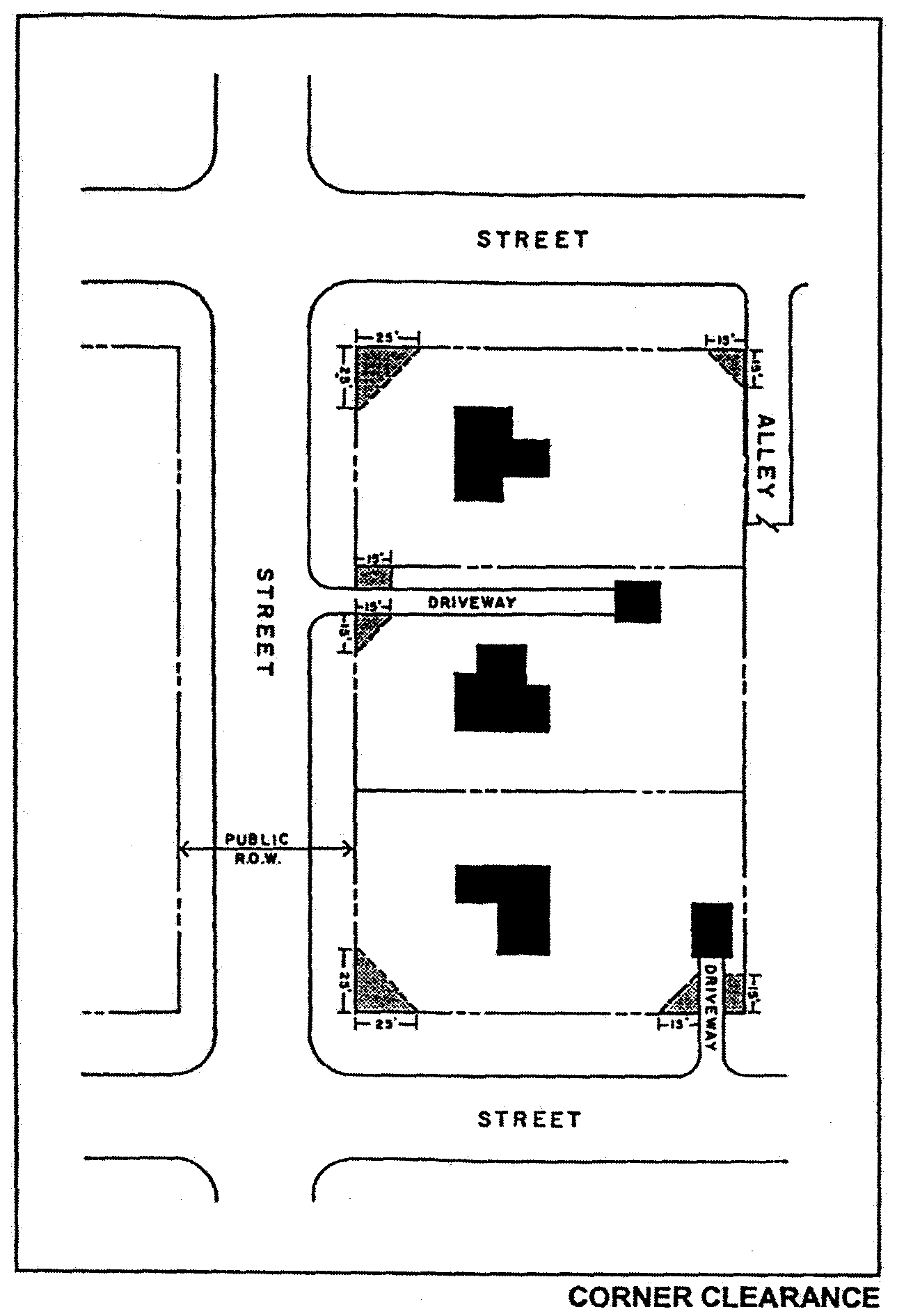 No fence, wall, shrubbery, sign, or other obstruction to vision above a height of 30 inches from the established street grades shall be permitted within the triangular area formed at the intersection of any street right-of-way lines by a straight line drawn between such right-of-way lines at a distance along each line of 25 feet from their point of intersection.