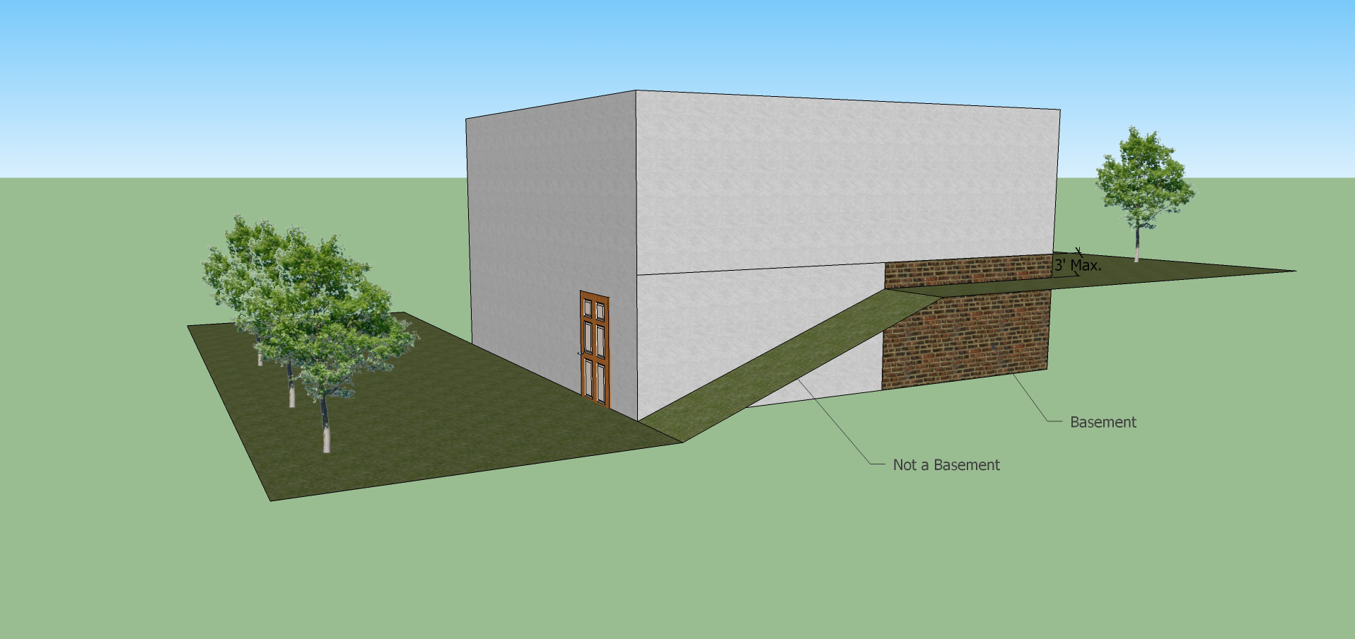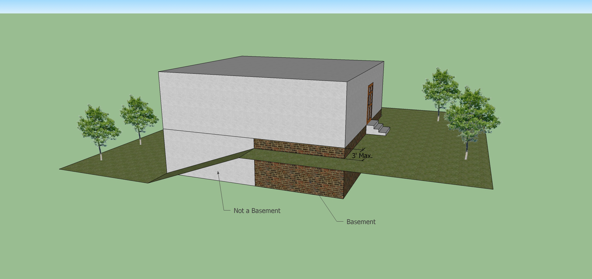 Basement shall mean that portion of the building which is below the finished floor elevation of the building and is located within the footprint of the first floor. A basement is not considered a story with regards to the height measurement of a building, unless the ceiling of the basement is greater than three feet above grade. The area of a basement completely under the first floor footprint and having no outside entrance shall be included as 75 percent of the building's floor area ratio calculations. The area of a basement with an outside entrance shall be included as 100 percent of the building's floor area ratio calculations. Basements shall conform to all setback regulations for structures. There shall be no entrances to such basement on the street side and the exterior appearance of such basement shall conform to the general architecture of the building.