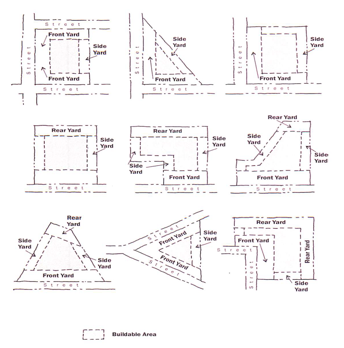 FRONT BUILDING SETBACK LINE (defining a front yard). A line parallel to the street right-of-way line which the building faces and takes its primary access from. Where lots have multiple frontages on one or more streets, the required front yard shall be provided on each street (see examples below).