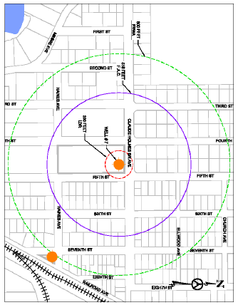 Arbitrary fixed radius: FDEP developed a statewide Wellhead Protection Rule, Chapter 62-521, Florida Administration Code. The protected zone consists of a 500 foot radial setback distance around a potable water well where groundwater is provided.