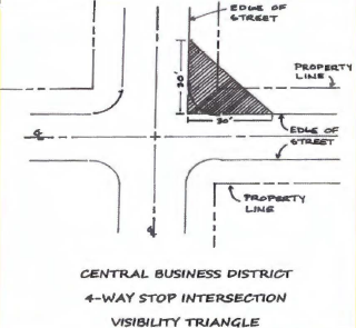 4-way Stop Street intersections within the Central Business District. Beginning at the intersection of each street edge, projected where rounded, thence in each direction along adjoining street edge for a distance of 30 feet, the thence connected in a straight line across the property to form a triangle.