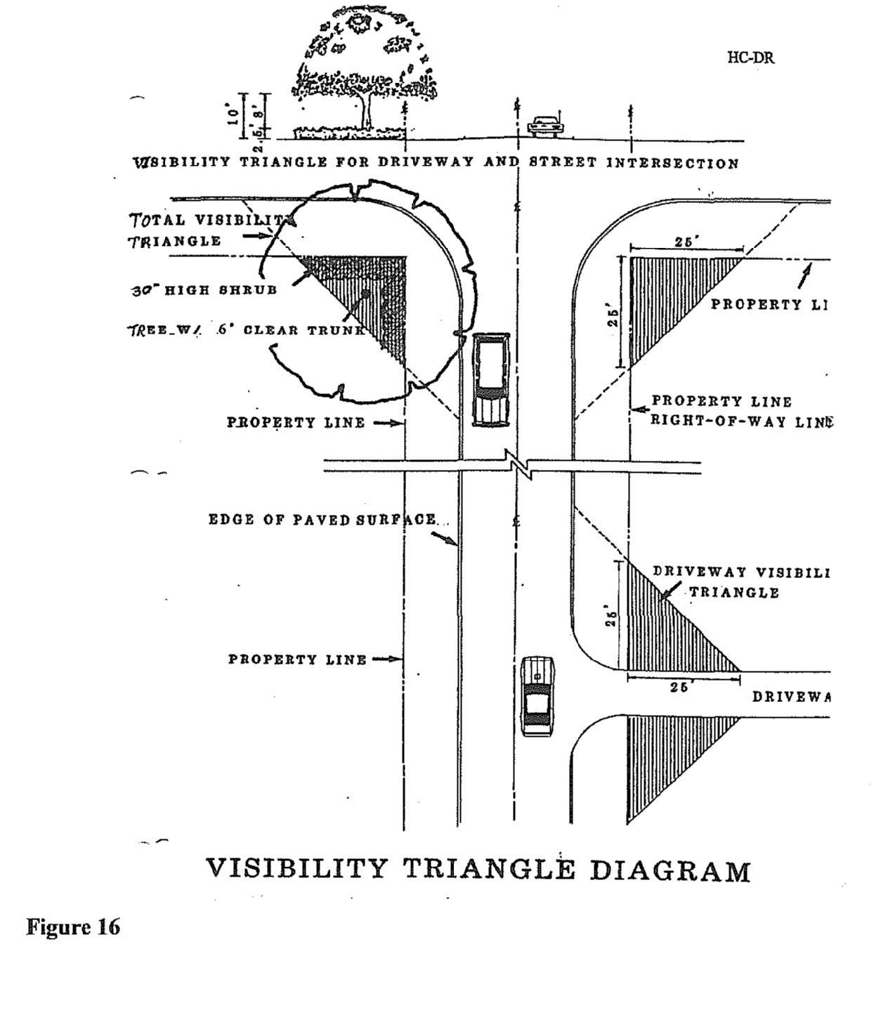 Intersections of driveways with streets. Beginning at the intersection of each driveway edge with the street right-of-way (property line), projected where rounded, thence along the street right-of-way for a distance of 25 feet, and thence connected in a straight line across the property to form a triangle. Where driveways are curved or intersect with the street right-of-way at other than right angles, a visibility triangle shall be provided giving equivalent visibility to drivers of cars on and entering the street. (See also the diagram on the following page.)