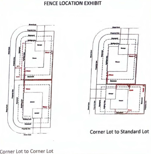 On residential corner lots, where the rear yard abuts the adjoining rear yard the property owner may elect to provide a solid decorative fence or wall, a maximum of six feet in height within the front side yard, but no closer than ten feet to the front side property line. This does not apply to corner lots where the rear yard abuts the side yard of the adjoining property. (See Fence Location Exhibit below) (Sight visibility requirements still apply per section 12.4.1)