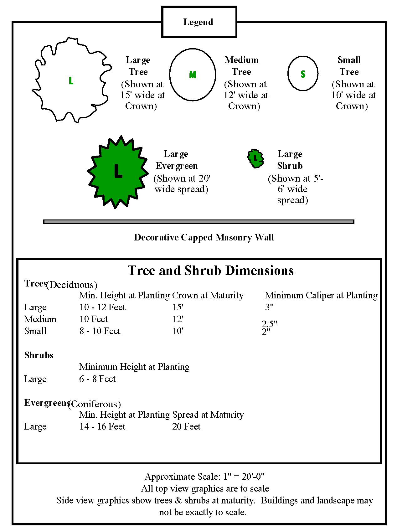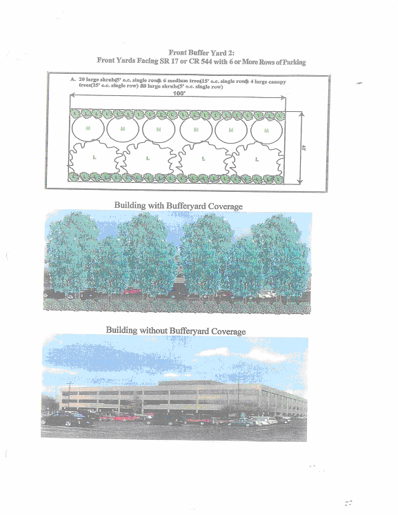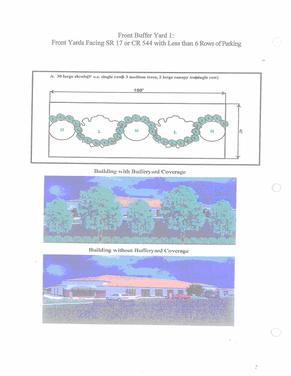 Front facade foundation landscaping. A minimum of at least one three- to five-gallon foundation shrub for every three linear feet of building front facade and one specimen tree of at least two inch caliper per 35 linear feet of building facade shall be placed along the foundation of any front facade facing SR 17 or CR 544. The shrubs shall be a minimum of 30 inches tall at the time of planting. This landscaping requirement does not apply to portions of the building facade that provide access for pedestrians. The front facade landscaped area shall be at least five feet wide. Ground cover plants must fully cover the remainder of the five-foot landscaped area along the foundation.