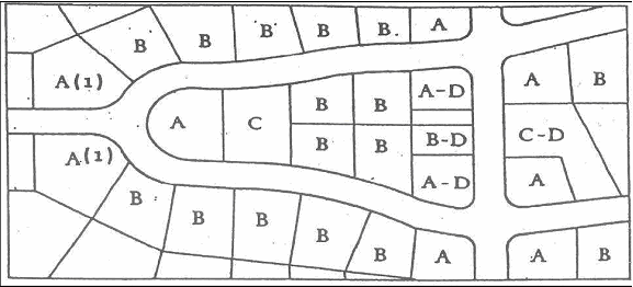 D is a reversed frontage lot, defined as a lot on which the frontage is at right angles or approximate right angles (interior angle less than 135 degrees) to the general pattern in the area. A reversed frontage lot may be a corner lot (A-D in the diagram), an interior lot (B-D) or a through lot (C-D).