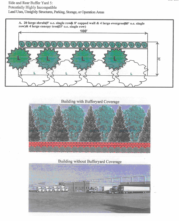 The width of a perimeter landscape buffer shall be five feet wide (exclusive of any curbing). While a greater width is allowed, it is not required in this district.