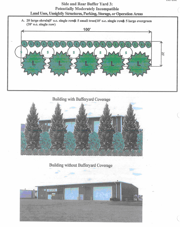 Perimeter landscaping for customer parking lots. Parking lots as well as related internal and perimeter landscaping shall comply with applicable Land Development Code. No parking shall be allowed to encroach into a required landscaped setback of buffer areas. A landscaped divider with concrete curbing shall be constructed to separate every 15 contiguous parking stalls. The landscape divider shall have a minimum dimension of ten feet and shall comprise a minimum total 100 square feet of landscaped area. One deciduous tree shall be required for each such divider.