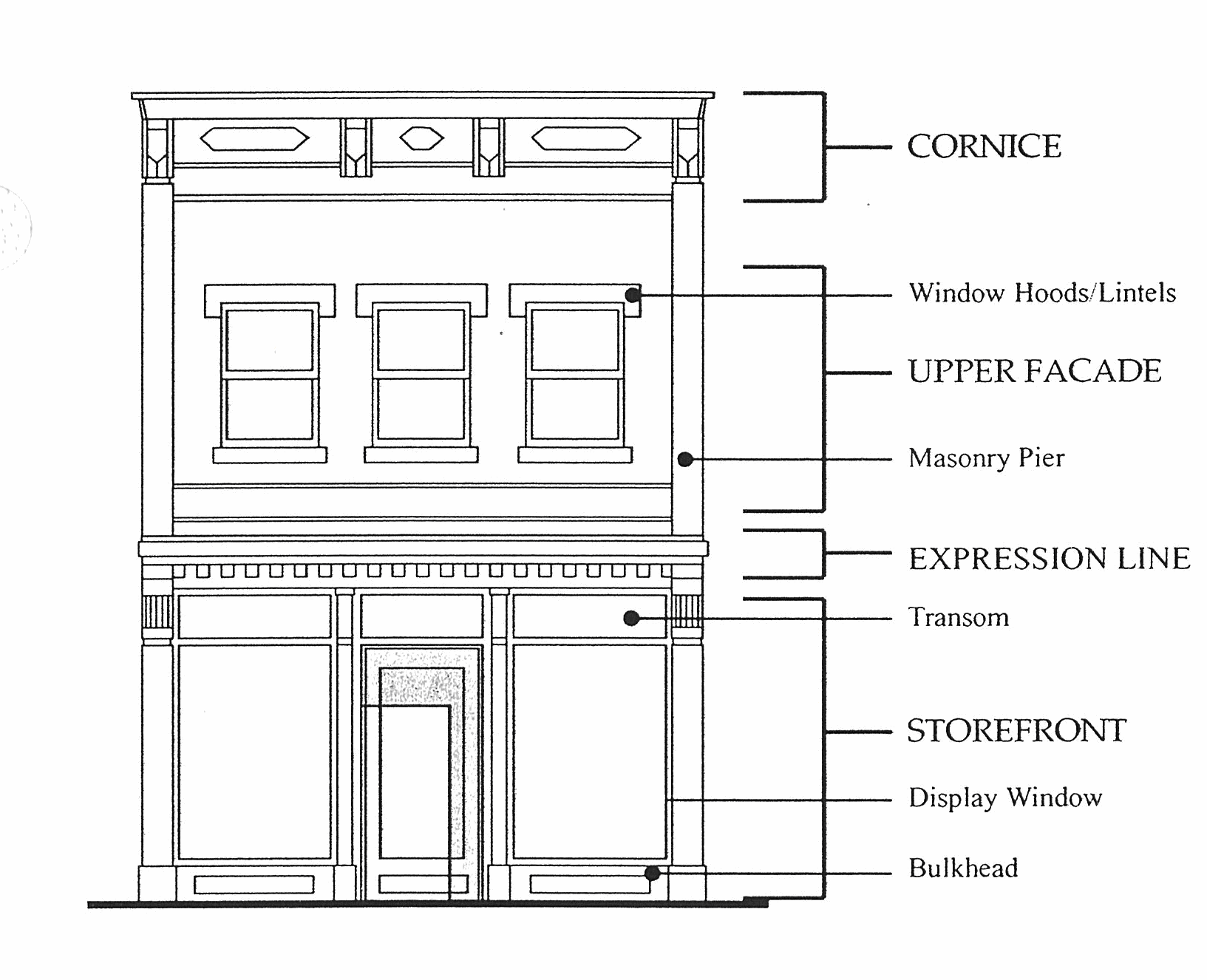 An expression line shall delineate the division between the first story and the second story. A cornice shall delineate the top of the facades. Expression lines and cornices shall either be moldings extending a minimum of two inches, or jogs in the surface plane of the building wall greater than two inches.