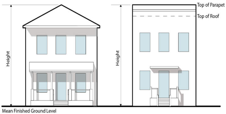 The vertical distance from the mean finished ground level at the front of the building to the highest point of a roof or parapet.