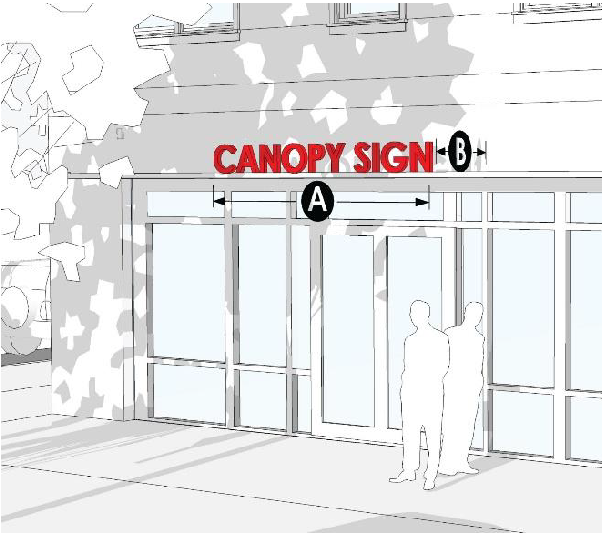 One sign per canopy facade per public street frontage with a maximum of 16 square feet is allowed, provided that the area used to display this information is no larger than 8 square feet and does not extend above or below the edge of the canopy.