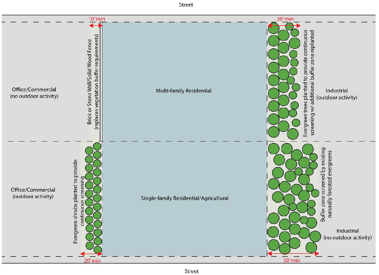 Buffers are required between incompatible land uses and zoning districts, around particular visually objectionable structures, and between certain land uses located along certain streets in order to provide separation and privacy and to reduce the impact of noise, debris, and undesirable lighting to adjacent properties.