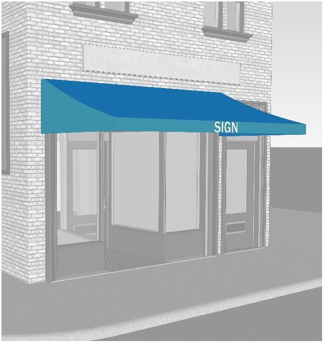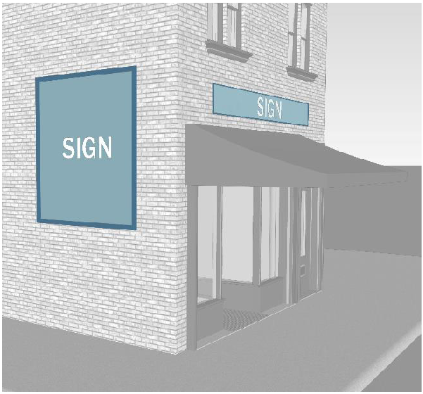 Sandwich board signs, awning signs, and window signs.
