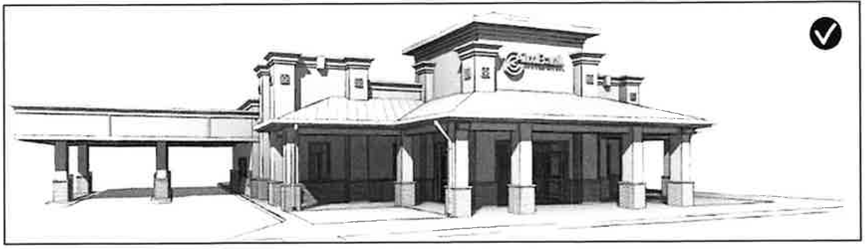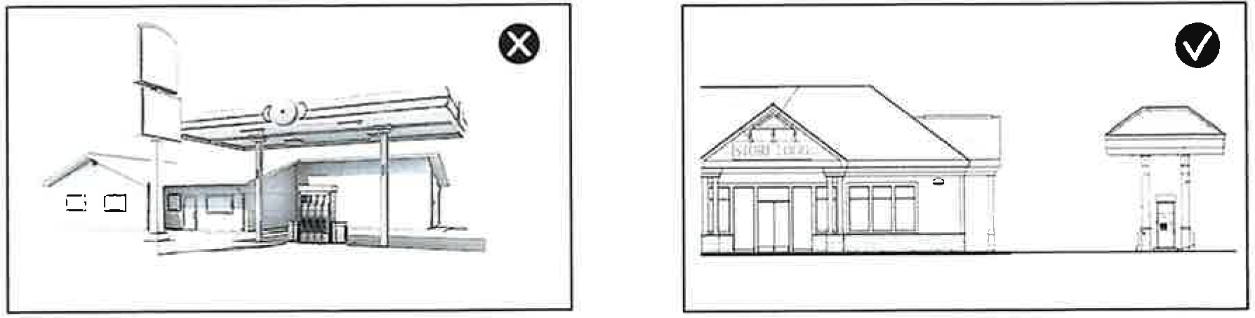 Buildings that derive their image solely from applied treatments that express corporate identity are discouraged.