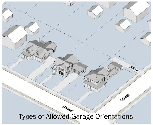 For lots with alley access, the garage or carport shall be placed to the rear of the dwelling unit or incorporated into the dwelling unit with the door or opening facing the alley.