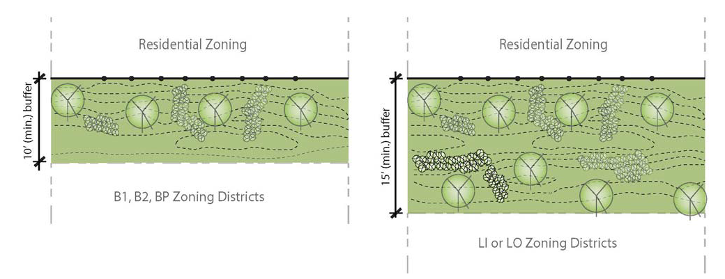 Parking may extend into the 50-foot rear yard building setback to within 30 feet of an arterial or collector street, provided the area between the parking and the abutting arterial or collector street is bermed and landscaped to a height of six feet at 70 percent opacity. Coniferous plant material must be used to provide a yearround screen.